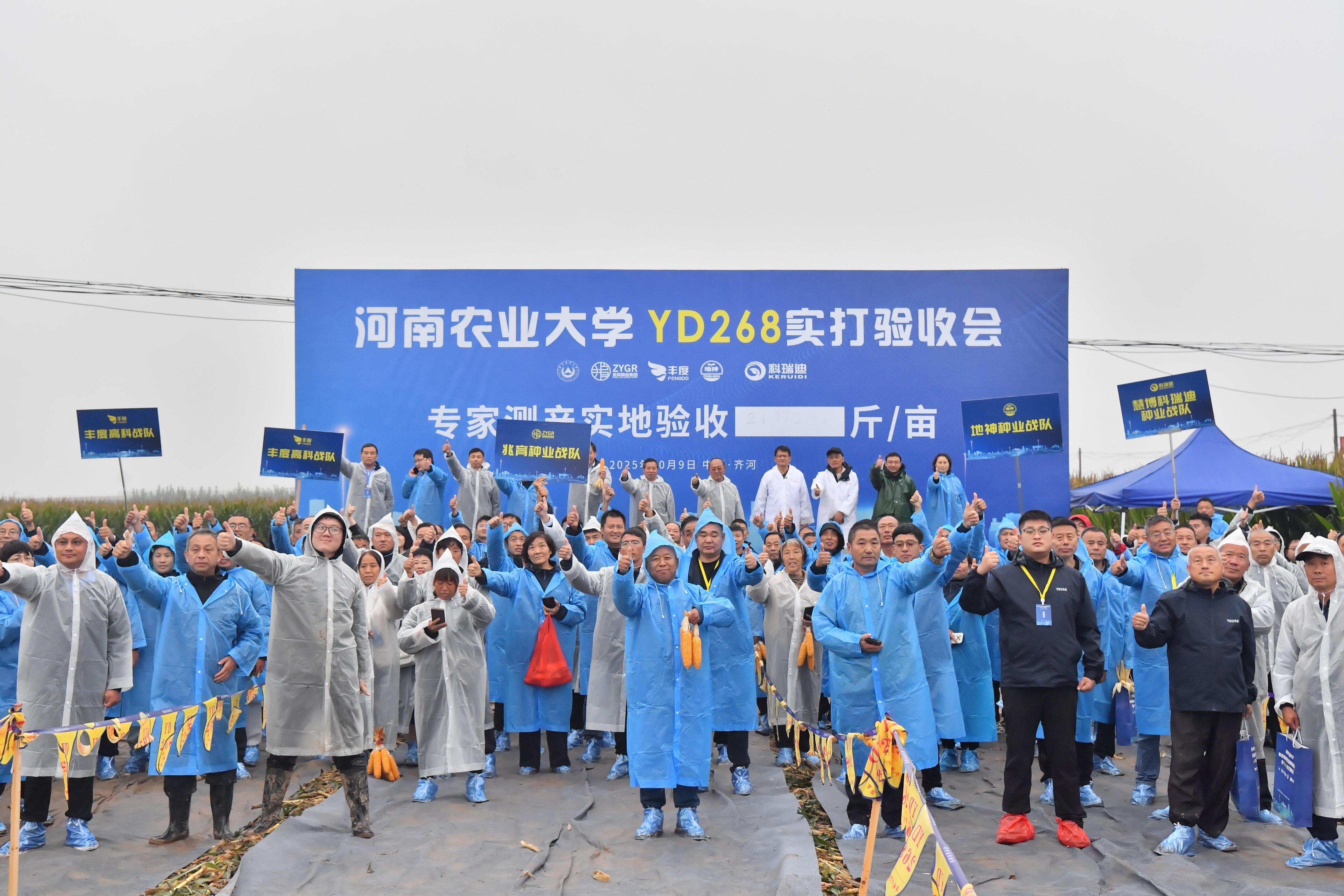 河南农业大学学术副校长、YD268育种团队负责人汤继华,学校社会服务处、农学院负责人,YD268育种团队成员,河北兆育种业集团有限公司、北京丰度高科种业有限公司、河南黄泛区地神种业有限公司、河南慧博科瑞迪农业科技有限公司主要负责人,以及来自黄淮海玉米主产区8个省区的种子经销商和种粮大户共600余人,现场见证YD268的现场测产。